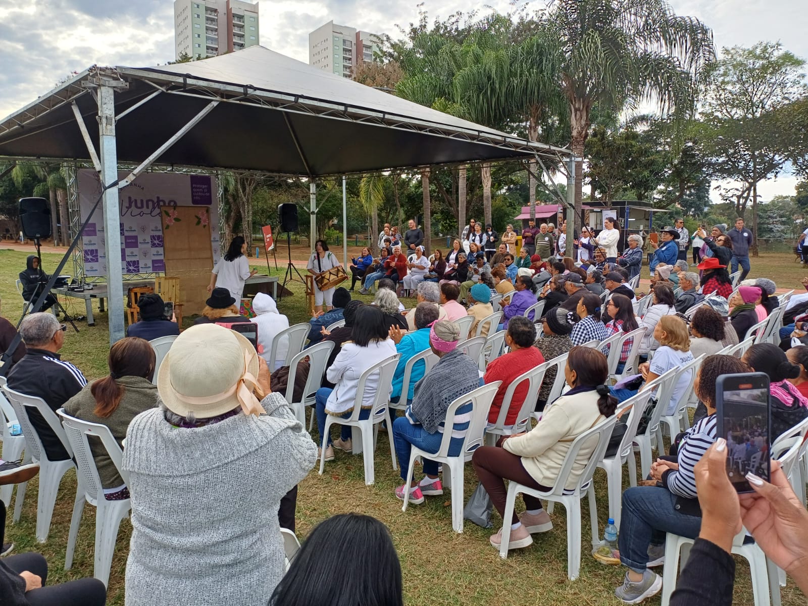 Música, dança e diversão embalaram a fria manhã de domingo (15/06), no OAPE (Observatório Parque Escola), localizado no Jardim Santa Clara do Lago, para o Dia “D” de Combate à Violência Contra a Pessoa Idosa. O evento organizado pela Prefeitura, faz parte do Junho Violeta, mês de conscientização sobre a violência contra a pessoa idosa e, de acordo com a Secretaria de Governo, contou com aproximadamente 300 pessoas. O Dia “D” foi organizado pela Departamento de Direitos Humanos e Políticas Públicas, envolvendo os Centros de Convivência da Melhor Idade do Jardim Amanda e do Remanso Campineiro, além do segmento do Idoso e o Conselho Municipal do Idosos.