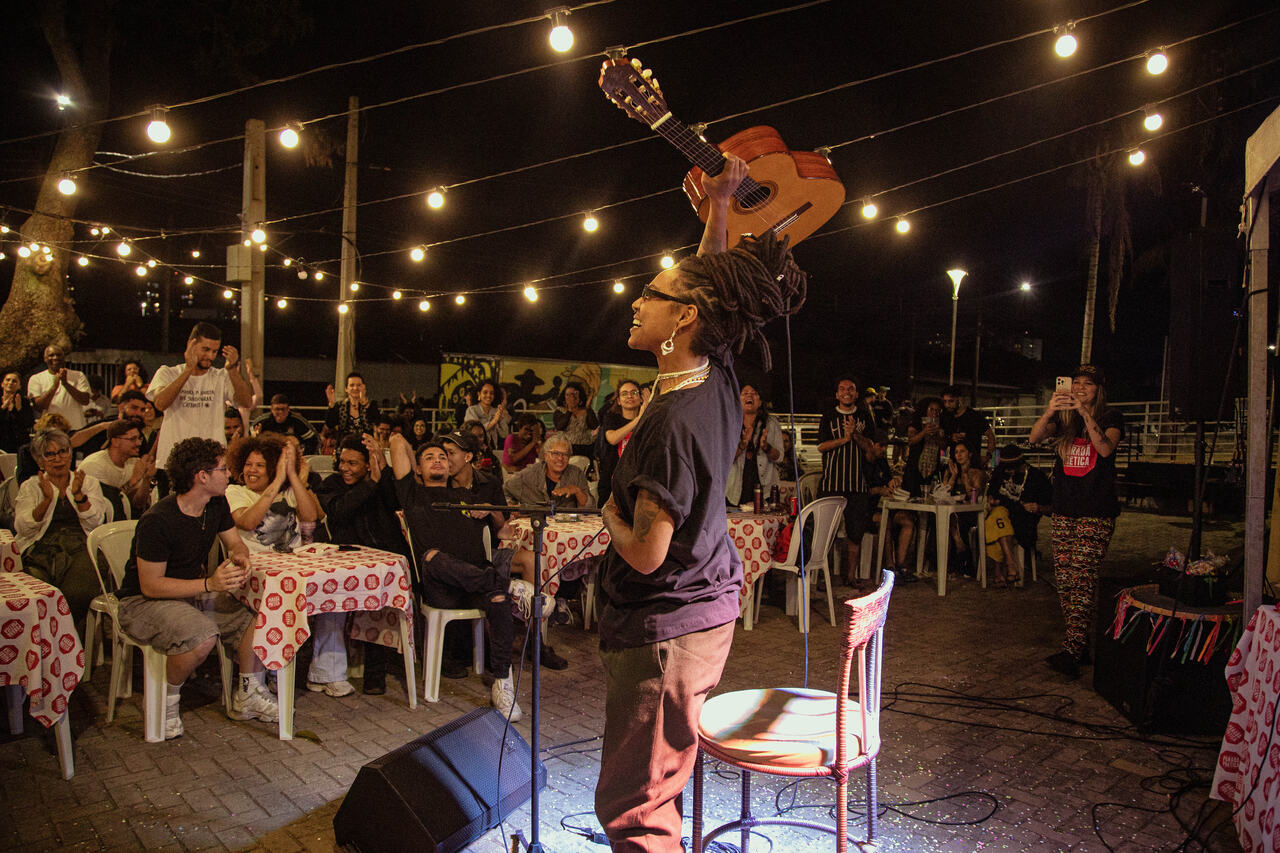 Com seu violão, Bia interpretou algumas de suas músicas mais conhecidas, como “Cota não é esmola”. A artista destacou o clima acolhedor do sarau.